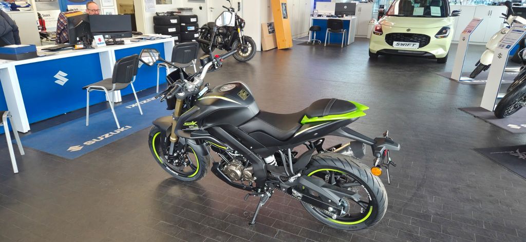 Die SRK 125 S ist das perfekte Naked Bike für alle, die sportlichen Look mit moderner Technik verbinden wollen. Der flüssigkeitsgekühlte 125 cm³ Einzylinder mit 15 PS sorgt für spritzige Performance im Alltag, während das 6-Gang-Getriebe präzises Schalten ermöglicht. Für Sicherheit und Kontrolle stehen Scheibenbremsen mit ABS sowie eine hochwertige Upside-Down-Gabel. Mit nur 143 kg fahrbereit, 790 mm Sitzhöhe und 10 Liter Tankvolumen ist die SRK 125 S ideal für Stadt, Landstraße und den täglichen Fahrspaß.